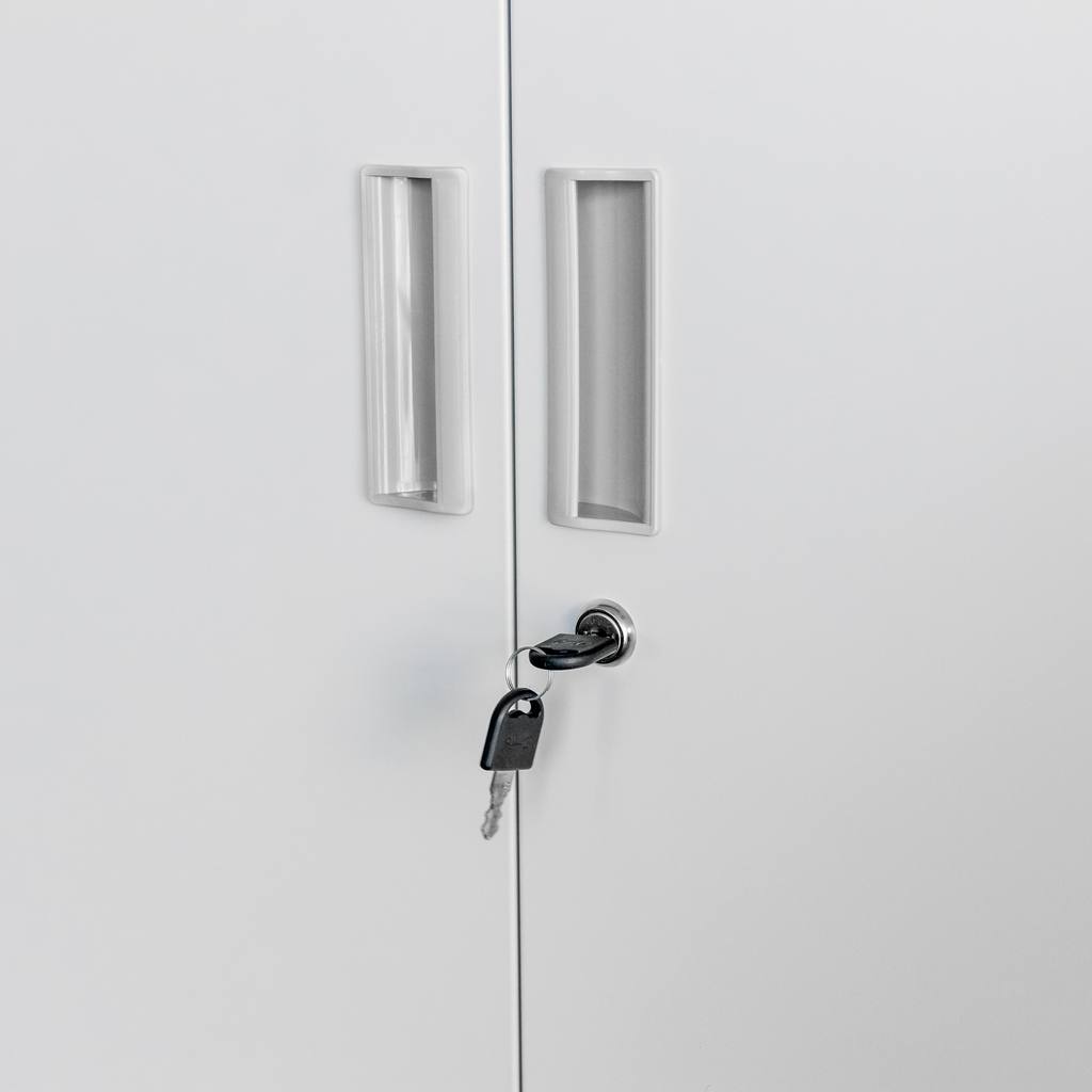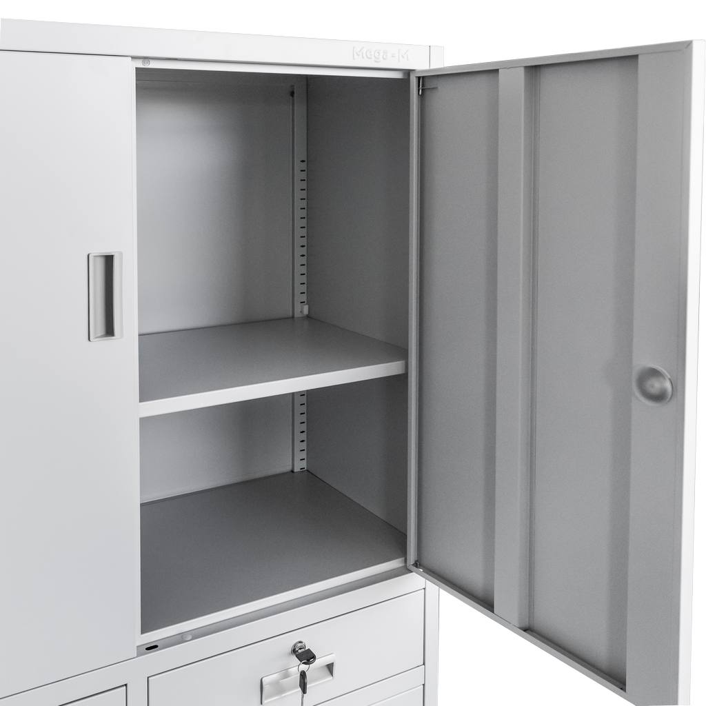 Szafa biurowa metalowa marki Mega-M zapewnia komfortowy dostęp i bezpieczeństwo przechowywania dokumentacji biurowej. Solidna konstrukcja wykonana z blachy stalowej, malowanej proszkowo, jest odporna na korozję. Szafa na dokumenty z pełnymi drzwiami oraz dwiema wygodnymi szufladami. Dzięki zastosowaniu zamka zabezpieczającego w każdym z elementów, bez przeszkód można przechowywać ważne akta bez dostępu osób trzecich. Szafa biurowa posiada dwie regulowane półki, dzięki czemu z łatwością można dostosować ich wysokość do wielkości np. segregatorów.