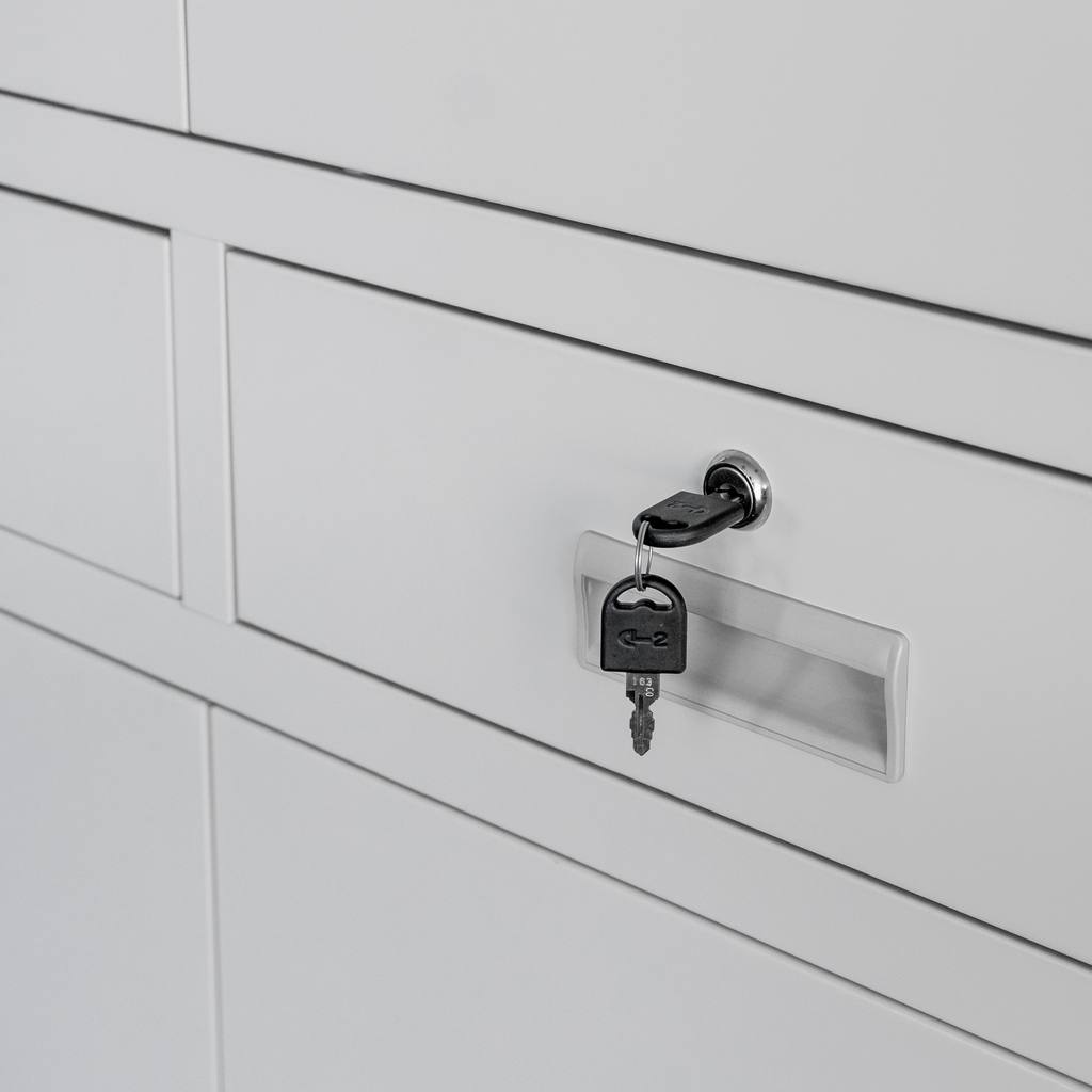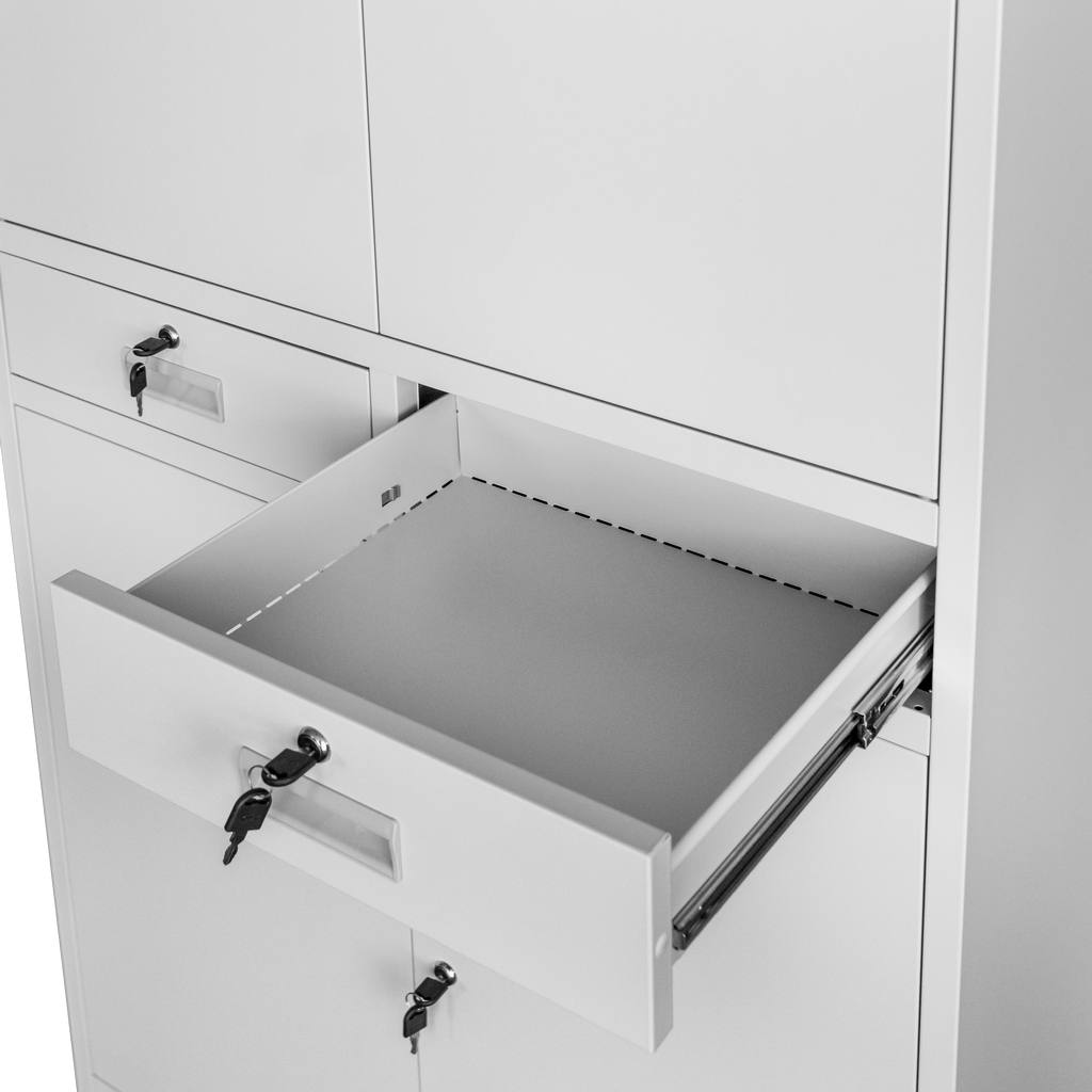 Biurowa szafa metalowa z szufladami i pełnymi drzwiami Mega-M WENUS – na akta i dokumenty