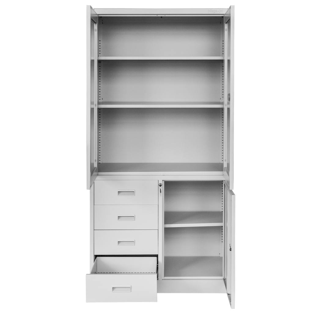 Szafa biurowa marki Mega-M to nowoczesny i funkcjonalny mebel do wielu zastosowań. Zapewnia wygodę przechowywania dokumentów, akt oraz różnych akcesoriów. Wykonana jest z blachy stalowej malowanej proszkowo odpornej na uszkodzenia oraz korozję. Szafa na dokumenty posiada przeszkloną witrynę, szafkę z pełnymi drzwiami oraz cztery wygodne szuflady. Dzięki zastosowaniu zamka zabezpieczającego w każdym z elementów, bez przeszkód można przechowywać poufne dokumenty i wartościowe rzeczy. Szafa biurowa posiada regulowane półki, dzięki czemu z łatwością można dostosować wysokość do wielkości segregatorów.