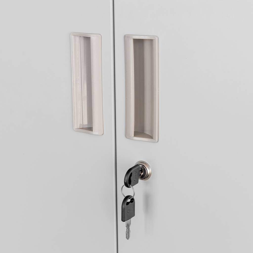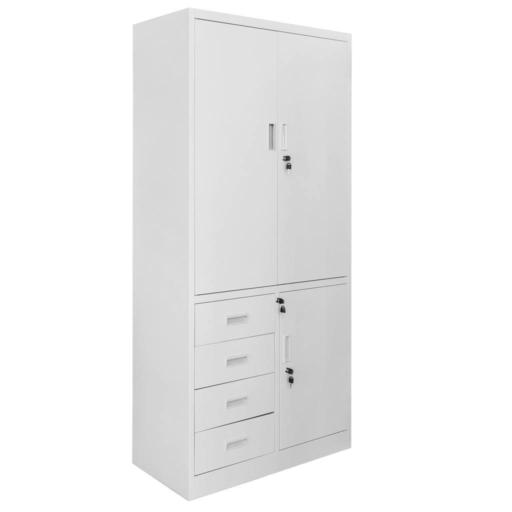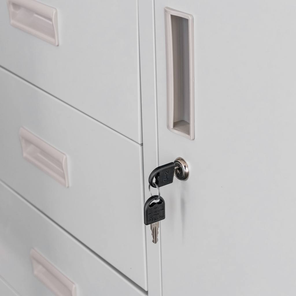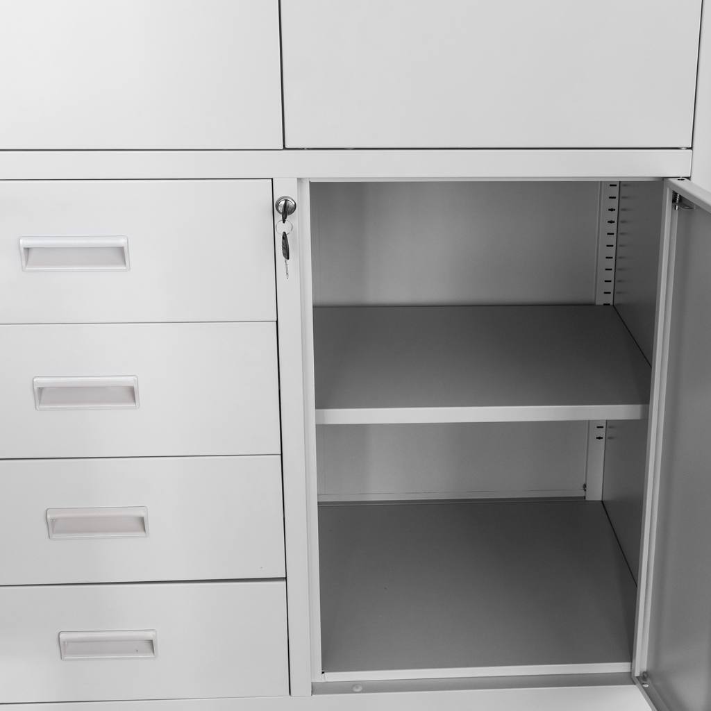 Szafa biurowa marki Mega-M to nowoczesny i funkcjonalny mebel do wielu zastosowań. Zapewnia wygodę przechowywania dokumentów i różnych akcesoriów. Wykonana jest z blachy stalowej malowanej proszkowo, odpornej na uszkodzenia oraz korozję. Szafa aktowa posiada dużą szafkę na segregatory, a w dolnej sekcji cztery wygodne szuflady oraz wąską szafkę. Dzięki zastosowaniu zamka zabezpieczającego w każdym z elementów, bez przeszkód można przechowywać ważne dokumenty i wartościowe rzeczy. Szafa biurowa posiada regulowane półki, dzięki czemu z łatwością można dostosować wysokość do wielkości segregatorów.