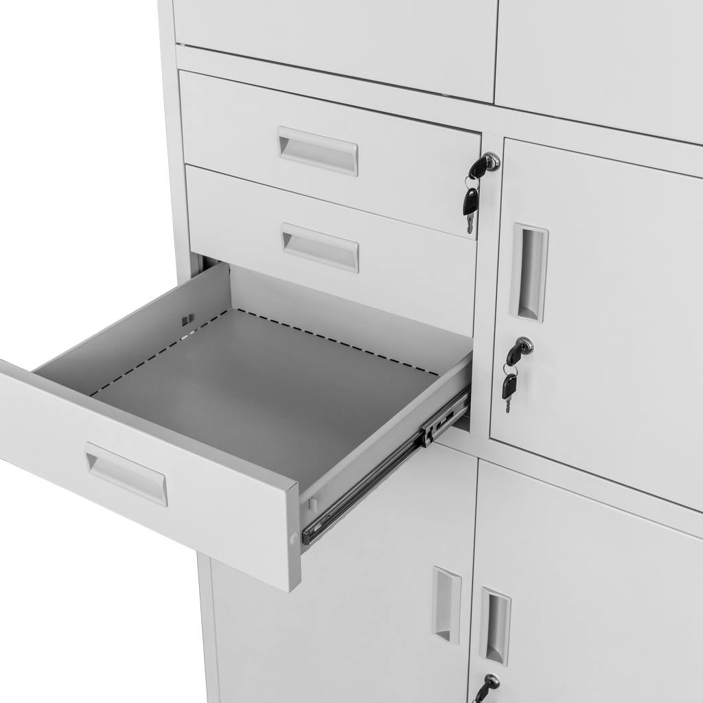 Szafa biurowa marki Mega-M to nowoczesny i funkcjonalny mebel do wielu zastosowań. Szafa aktowa z sejfem umożliwia przechowywanie dokumentów i cennych przedmiotów w sposób bezpieczny. Solidna i trwała konstrukcja z blachy stalowej malowanej proszkowo jest odporna uszkodzenia mechaniczne i korozję. Szafa aktowa posiada dwie szafki na segregatory, w środkowej części trzy wygodne szuflady oraz sejf. Dzięki zastosowaniu zamka zabezpieczającego w każdej sekcji, wszystkie poufne dokumenty są przechowywane pod kluczem. Wygodne regulowane półki z łatwością można dostosować do wielkości segregatorów.