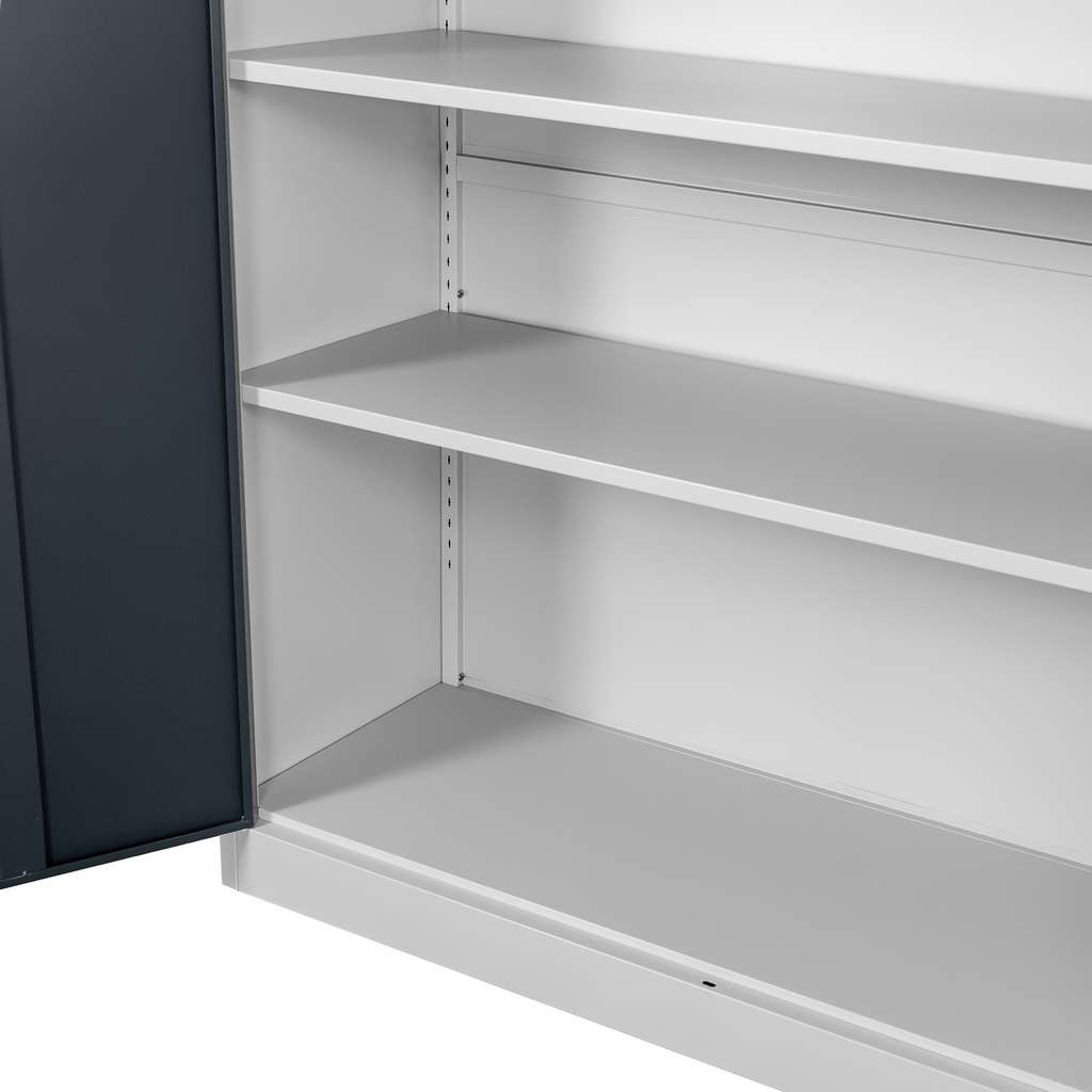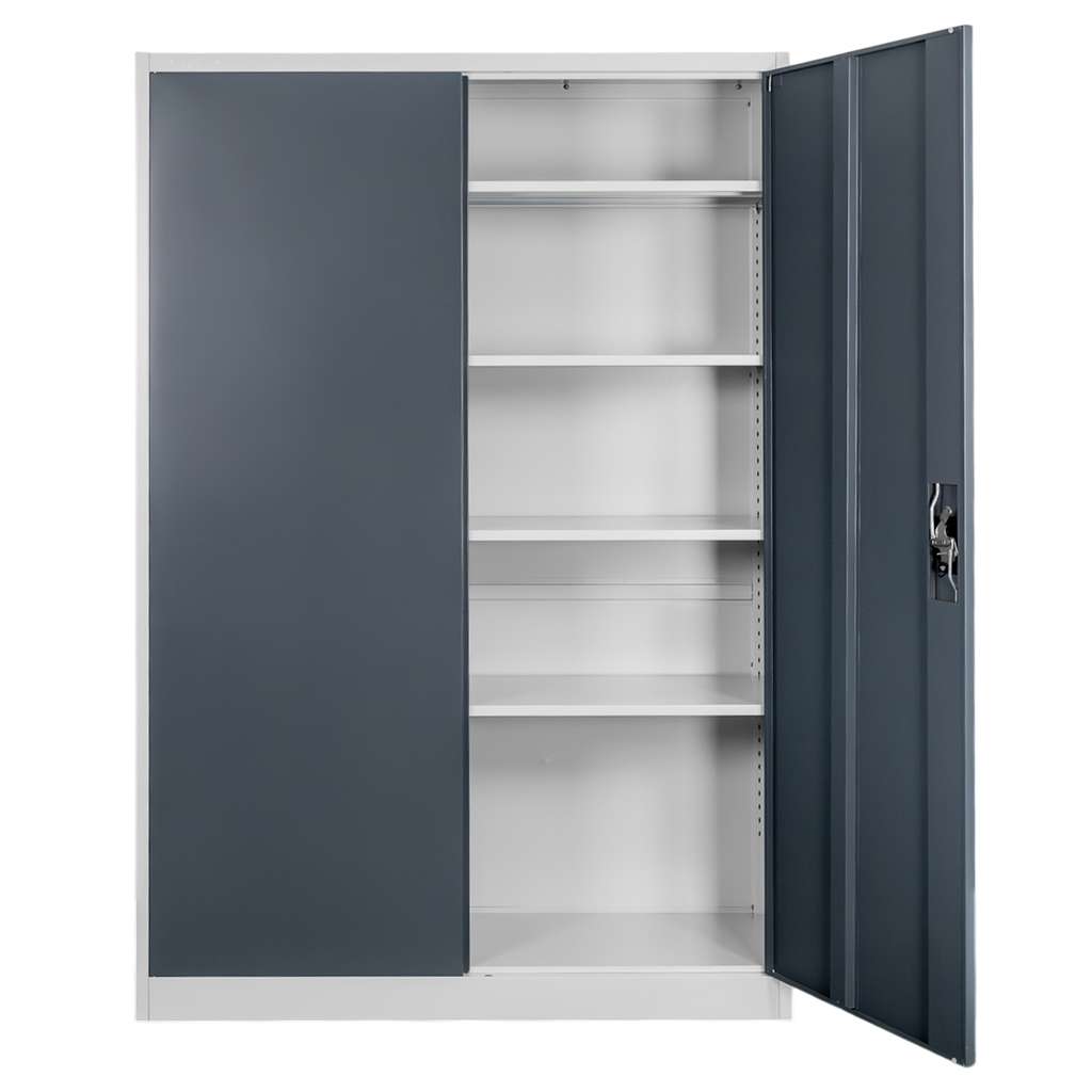 Szafa biurowa metalowa Mega-M w kolorze szarym z grafitowymi drzwiami to połączenie estetyki i funkcjonalności. Jej szerokość 120 cm zapewnia o wiele większą pojemność niż tradycyjne szafy 90 cm. Wykonana z wytrzymałej blachy stalowej malowanej proszkowo jest odporna na korozję i łatwa w utrzymaniu czystości. Trzypunktowy zamek chroni zawartość przed dostępem osób trzecich. Szafa na dokumenty posiada 4 poziomy półek z możliwością zmiany wysokości, które umożliwiają dostawnie półki do wielkości przechowywanych rzeczy.