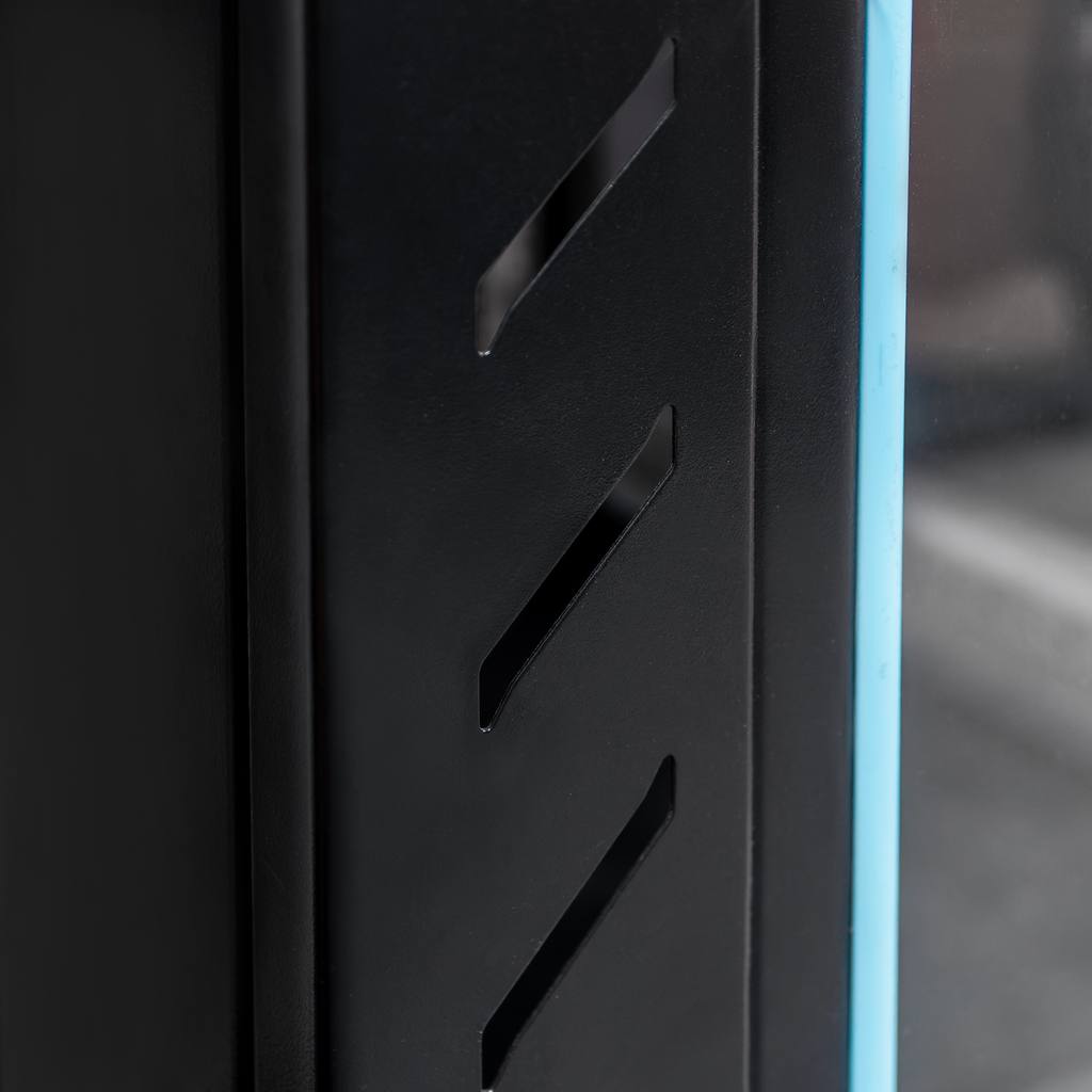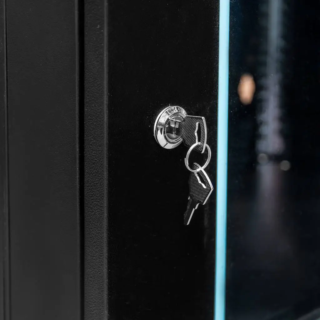 Szafa wyposażona w przeszklone drzwi przednie z szybą hartowaną oraz zatrzaskowe osłony boczne w całości stalowe. Produkt przeznaczony jest tylko do zastosowania wewnątrz pomieszczeń.