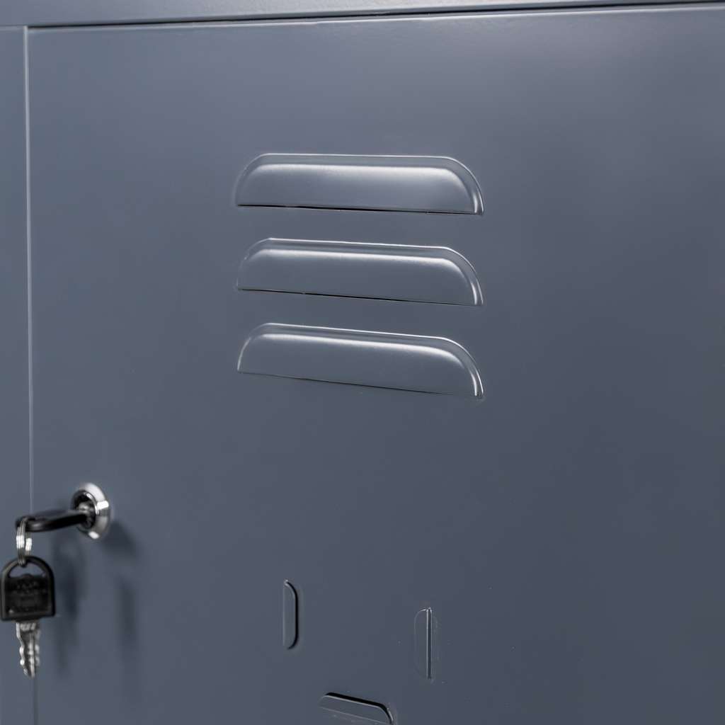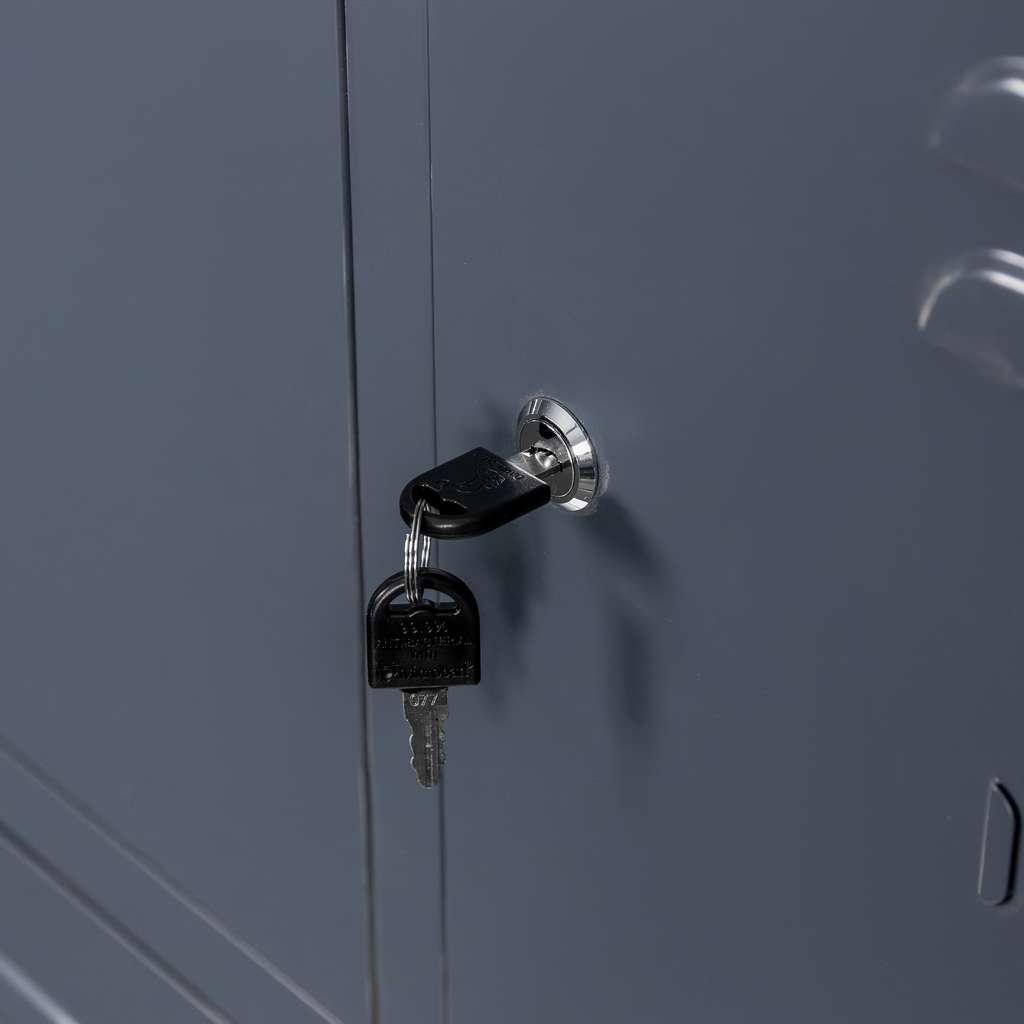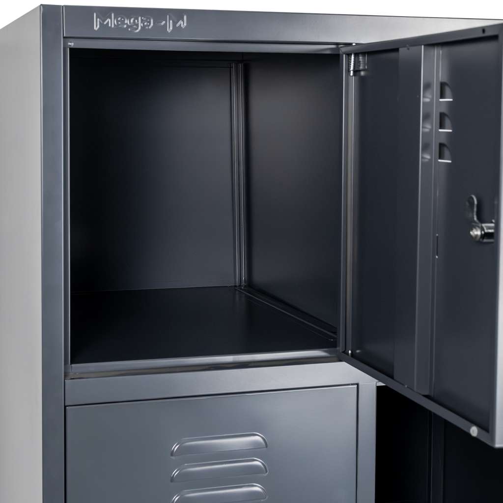 Całkowicie grafitowa wersja szafki skrytkowej BHP Mega-M prezentuje się wyjątkowo elegancko. To doskonała propozycja do przechowywania rzeczy osobistych oraz ubrań w nowoczesnych wnętrzach prywatnych gabinetów, klubów fitness oraz przestrzeni publicznych. Stalowy korpus malowany proszkowo chroni szafkę przed korozją i zniszczeniem. Układ szafki w dwóch kolumnach po cztery skrytki zapewnia wygodę użytkowania nawet w mniejszych pomieszczeniach. Każda skrytka jest zamykana na klucz, posiada wizytownik i wentylowane drzwi, które zapewniają odpowiednią cyrkulację powietrza.