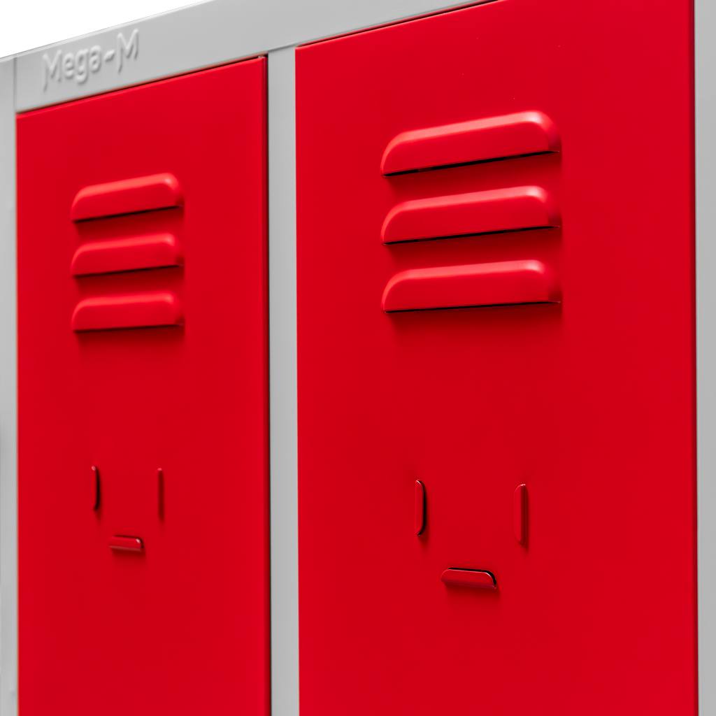 Szafka ubraniowa BHP marki Mega-M to niezawodne rozwiązanie do przechowywania odzieży roboczej i przedmiotów osobistych w miejscach pracy. Wykonana z wytrzymałej blach stalowej malowanej proszkowo jest odporna na korozję i intensywne użytkowanie. Boki szafki w kolorze szarym oraz czerwony front nadają jej nowoczesny wygląd. Szafka dwukomorowa posiada praktyczną półkę oraz drążek z haczykami na odzież. Skrzelowe otwory wentylacyjne zapewniają odpowiednią cyrkulację powietrza. Produkt do samodzielnego montażu – instrukcja montażu szafki BHP.
