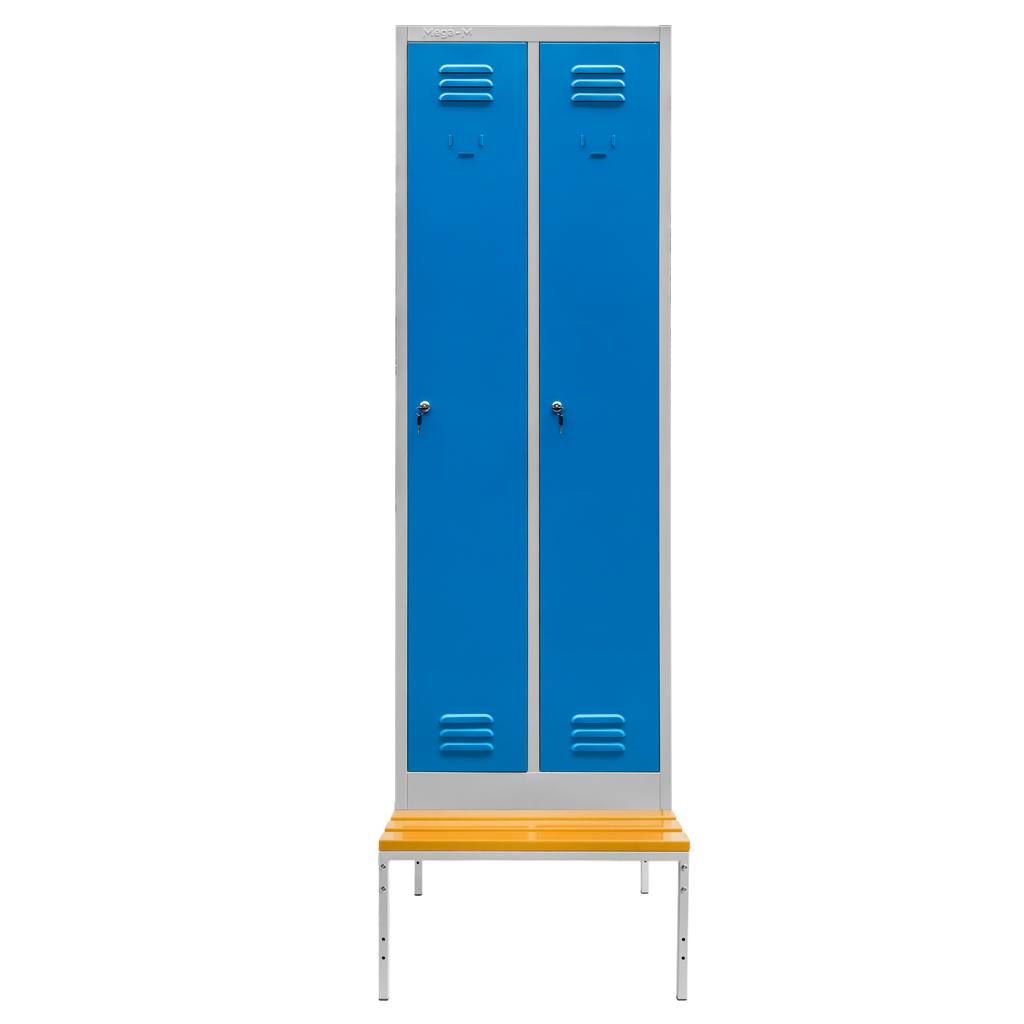 Szafka BHP ubraniowa na podstawie z ławeczką Mega-M pracownicza 2-drzwiowa S-60 cm szara/niebieski front