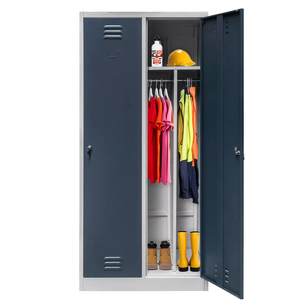 Praktyczna szafka ubraniowa pracownicza BHP marki Mega-M to niezastąpiony element wyposażenia każdej szatni. Wersja o szerokości 80 cm została wykonana z trwałej blachy stalowej, pokrytej odporną na korozję i zarysowania powłoką proszkową. Korpus w kolorze szarym i grafitowe drzwi tworzą nowoczesny, elegancki wygląd, który dobrze wpisuje się w przestrzenie socjalne, magazynowe czy sportowe. Wnętrze szafki podzielone jest na dwie komory, z których każda zawiera przegrodę, ułatwiającą oddzielenie rzeczy osobistych od roboczych.