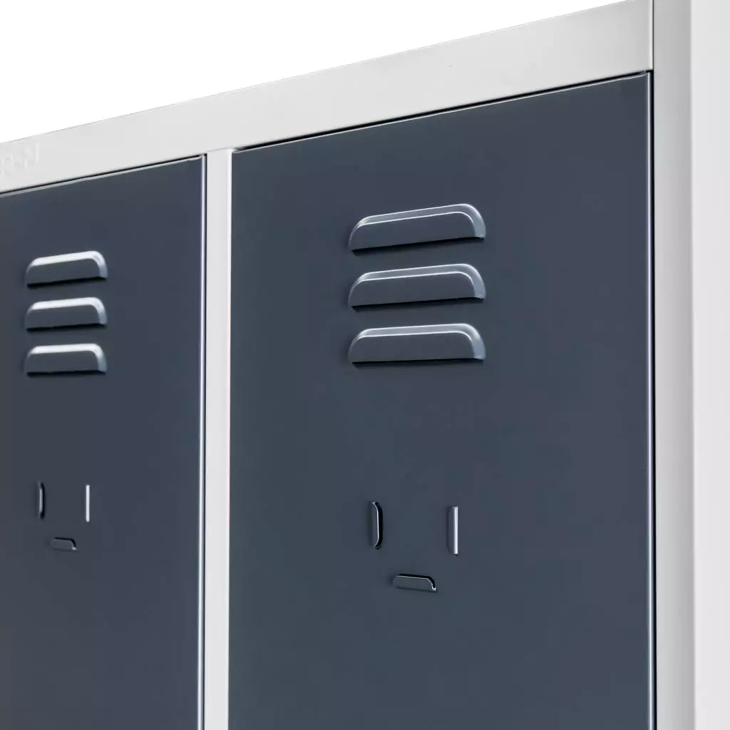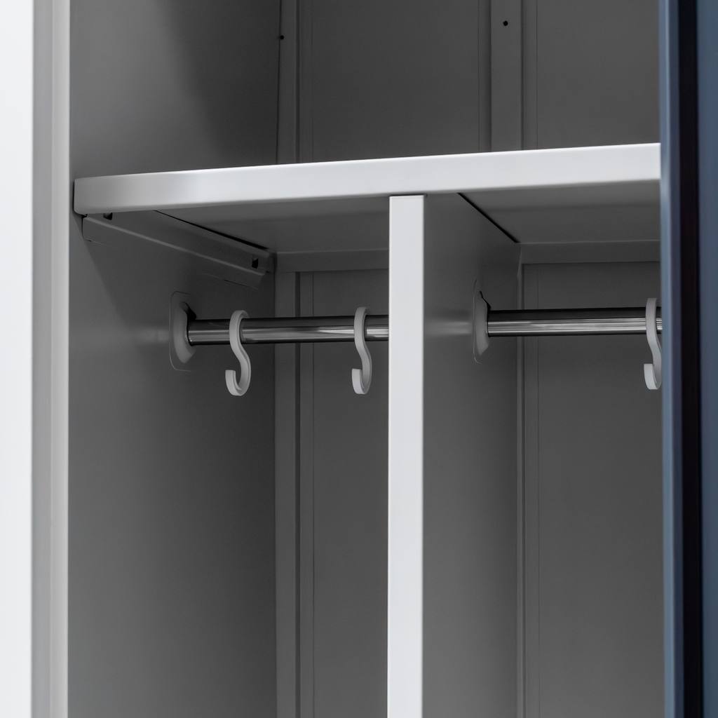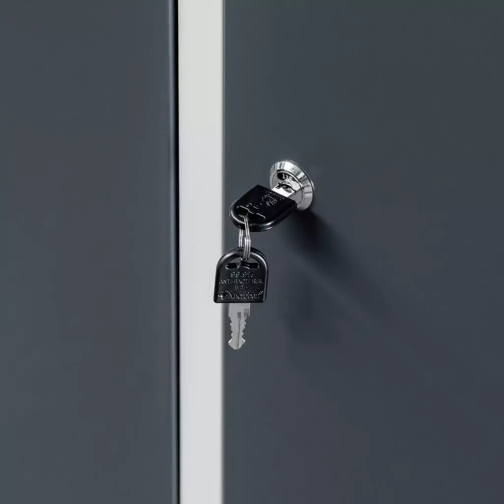 Skrzelowe otwory wentylacyjne umieszczone w drzwiach, zapewniają odpowiednią cyrkulację powietrza i przeciwdziałają zawilgoceniu oraz nieprzyjemnym zapachom. Dodatkowo szafka posiada zamek cylindryczny z dwoma kluczami oraz miejsce na etykietę lub numer. Dostarczana w wersji do samodzielnego montażu – instrukcja montażu szafki BHP.
