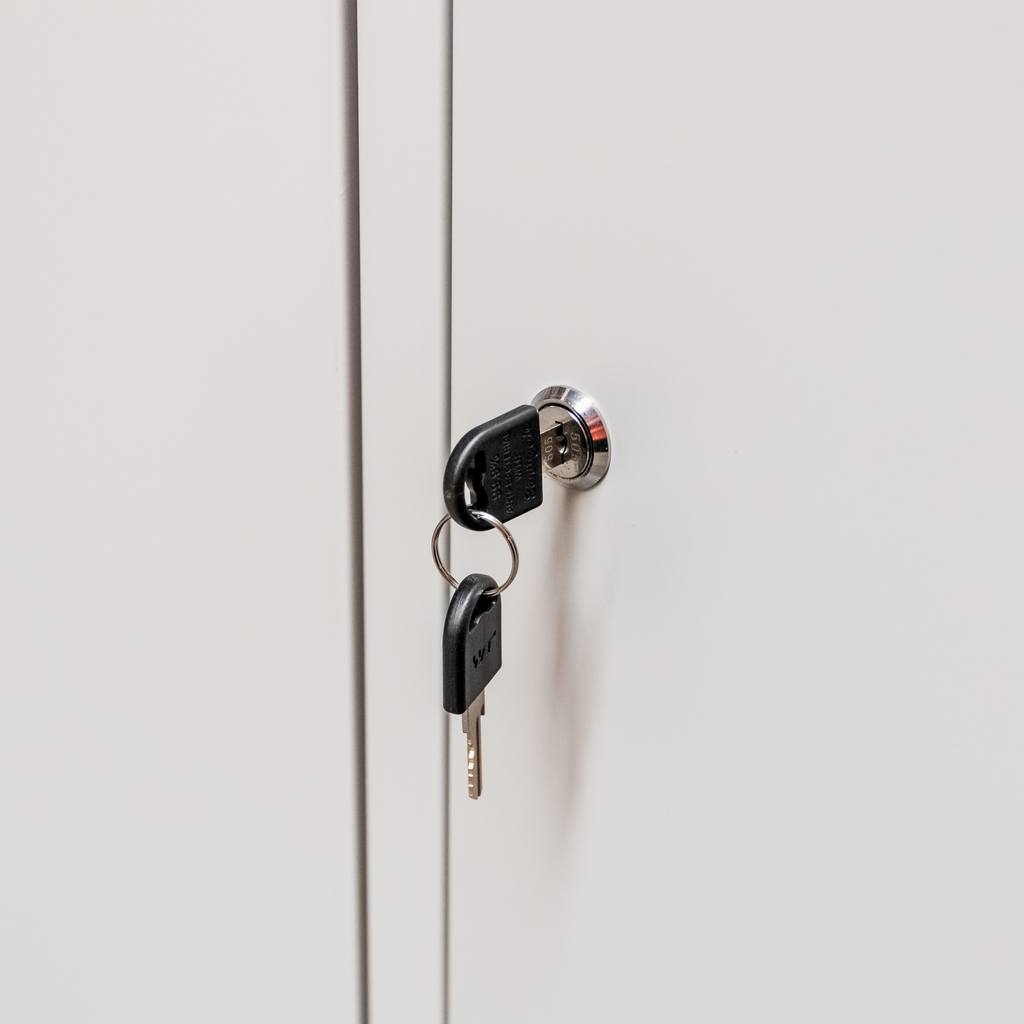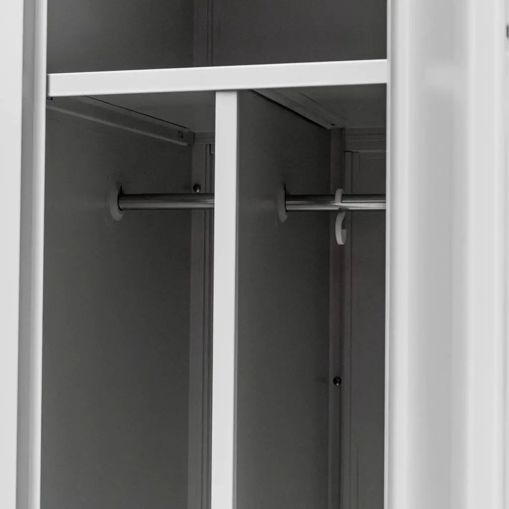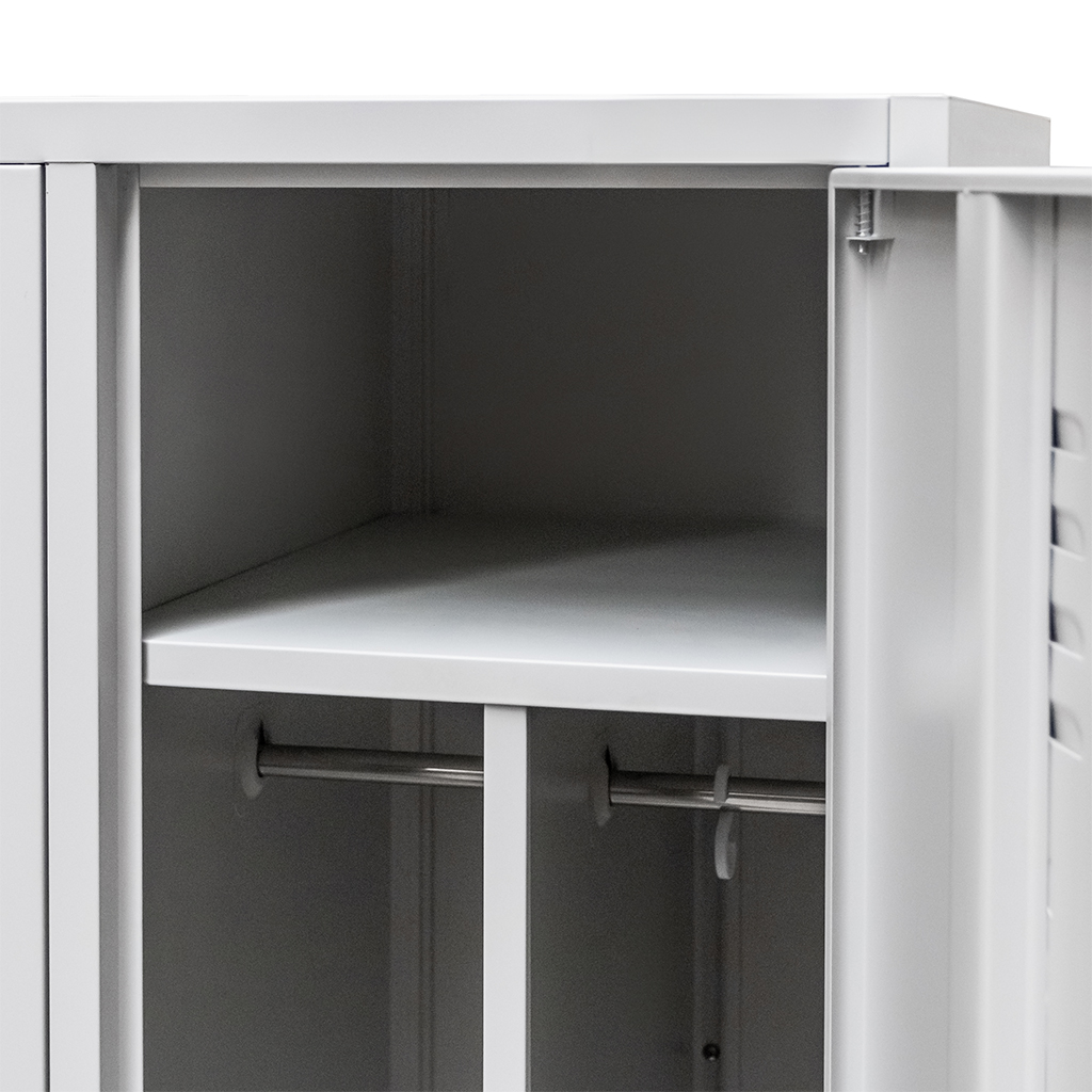 Szafka ubraniowa BHP marki Mega-M o szerokości 80 cm to niezawodne wyposażenie szatni pracowniczych, pomieszczeń socjalnych, siłowni, basenów czy placówek medycznych. Wykonana została z wysokiej jakości stalowej blachy malowanej proszkowo, co zapewnia trwałość, odporność na korozję oraz estetyczny, szary wygląd pasujący do każdego wnętrza. Szafka składa się z dwóch niezależnych komór z wewnętrznymi przegrodami, które umożliwiają rozdzielenie odzieży czystej i roboczej. Każda część wyposażona jest w półkę oraz drążek z haczykami. Drzwi szafki posiadają otwory wentylacyjne umożliwiające odprowadzanie nadmiaru wilgoć.