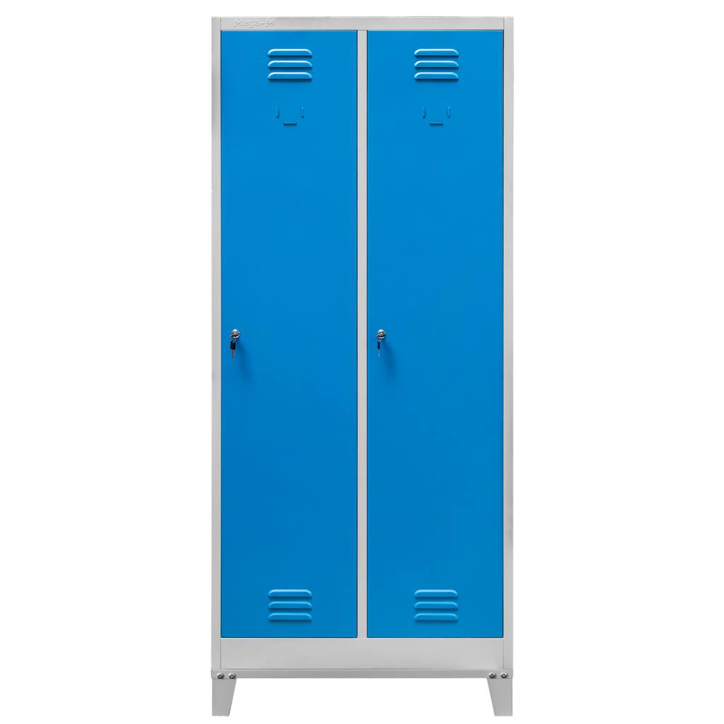 Szafka BHP ubraniowa na podstawie z nóżkami Mega-M pracownicza 2-drzwiowa z przegrodami S-80 cm szara/niebieski front
