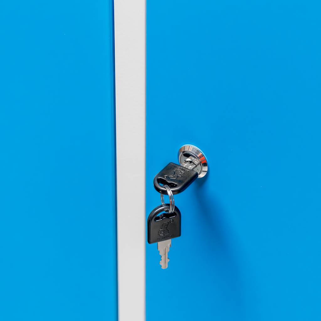 Szafka ubraniowa BHP Mega-M na stabilnej podstawie z nóżkami to solidne i estetyczne rozwiązanie, idealne do wszystkich szatni pracowniczych, zakładów przemysłowych, przestrzeni socjalnych, siłowni, klubów fitness, basenów i pozostałych obiektów sportowych. Model o szerokości 80 cm został wyprodukowany z zastosowaniem wysokogatunkowej blachy stalowej, odpornej na korozję i intensywną eksploatację. Szary korpus szafki BHP doskonale współgra z frontami w jasnym niebieskim kolorze, nadając szafce atrakcyjny wygląd. Metalowa szafka BHP została wyposażona w dwie oddzielne komory z wewnętrznymi przegrodami, które umożliwiają komfortowe i higieniczne przechowywanie zarówno odzieży roboczej, jak i codziennej.