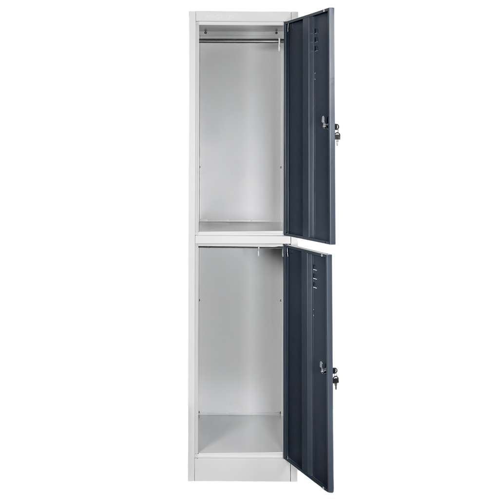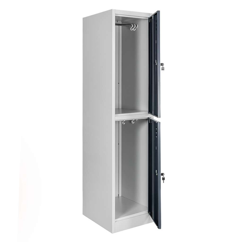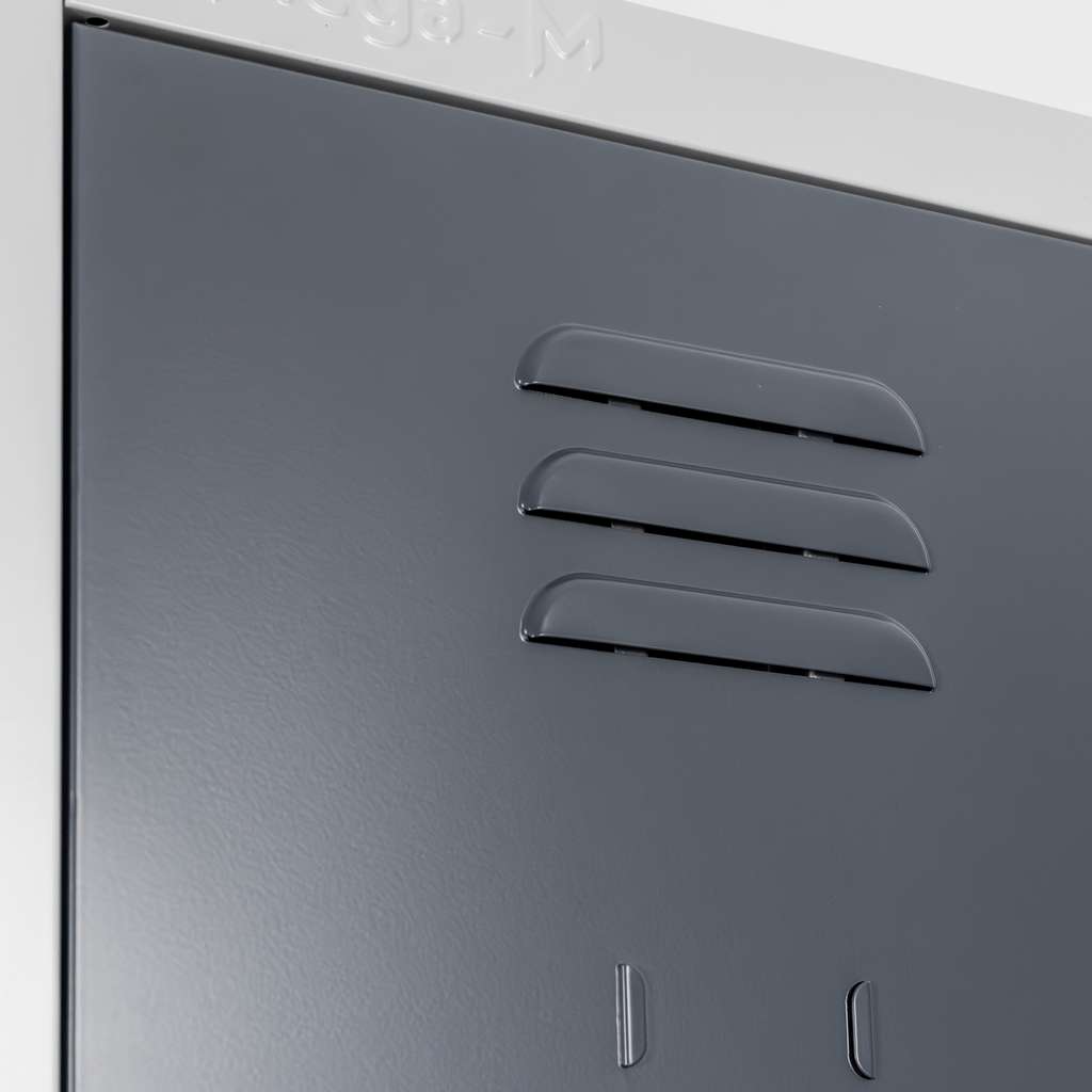Szafka skrytkowa Mega-M w wersji szarej z grafitowym frontem to połączenie nowoczesnego wykonania i kompaktowej budowy. Szafka 2- drzwiowa przeznaczona jest do przechowywania odzieży roboczej i rzeczy osobistych w zakładach pracy oraz instytucjach publicznych. Konstrukcja z blachy stalowej malowanej proszkowo, zapewnia odporność na codzienne intensywne użytkowanie. Kompaktowe wymiary pozwolą zmieścić ją nawet w niewielkich pomieszczeniach socjalnych. Szafka posiada dwie oddzielne komory, każda wyposażona w drążek z haczykami. Drzwi szafki wyposażone są w otwory wentylacyjne, które zabezpieczają przed gromadzeniem się wilgoci.