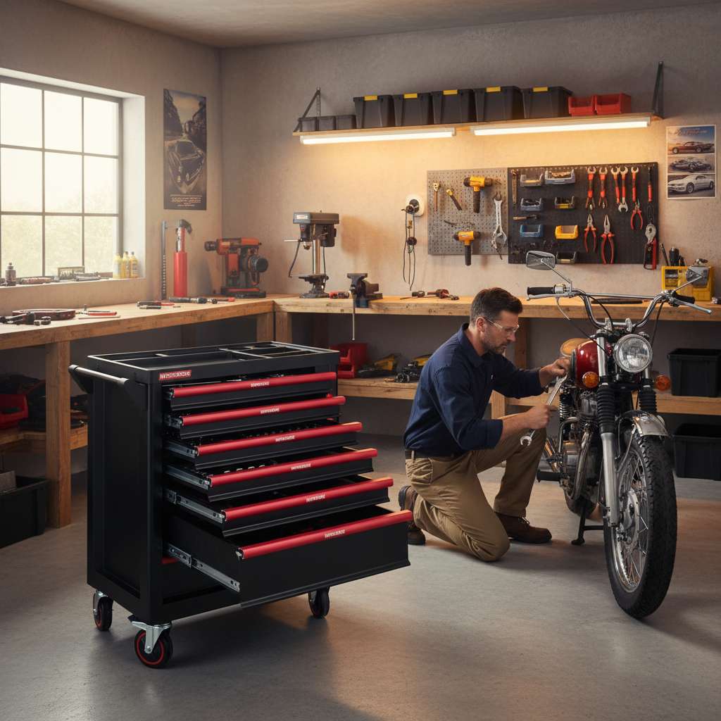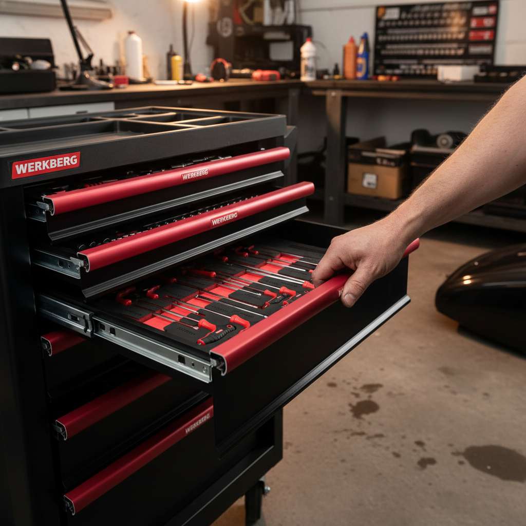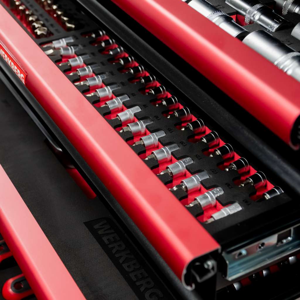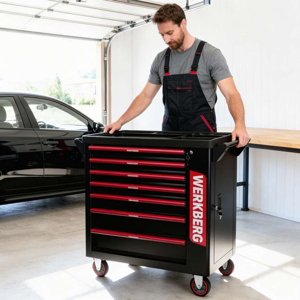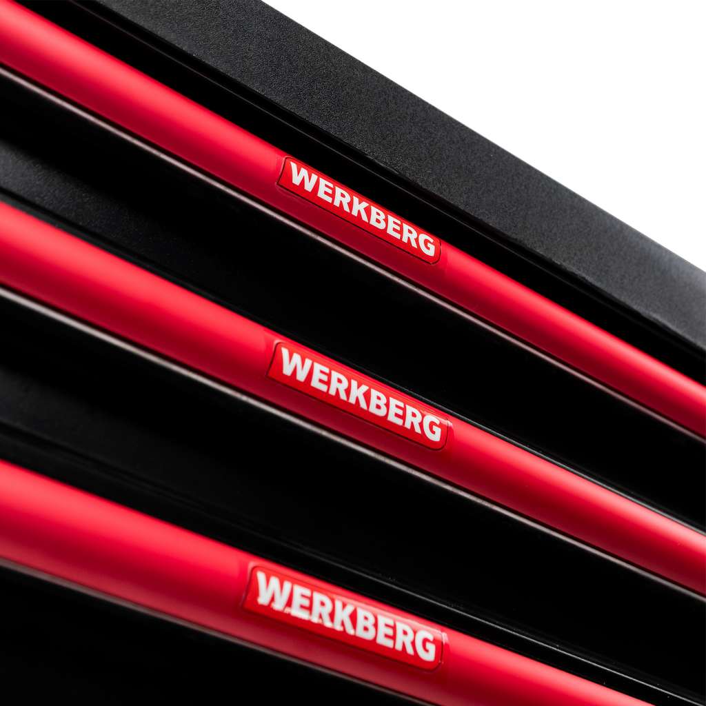 Wózek warsztatowy WERKBERG PRO 7 z zestawem 259 elementów, to przemyślane mobilne centrum narzędziowe dla profesjonalistów i majsterkowiczów. Korpus wózka został wykonany ze stali lakierowanej proszkowo, dzięki czemu całość jest odporna na uszkodzenia, intensywne użytkowanie i trudne warunki panujące w warsztacie. Siedem pojemnych szuflad osadzonych na płynnie działających prowadnicach kulowych, umożliwia szybki dostęp do narzędzi i zachowanie idealnego porządku. Wygodę w przemieszczaniu zapewniają kółka skrętne, zwiększające elastyczność pracy.