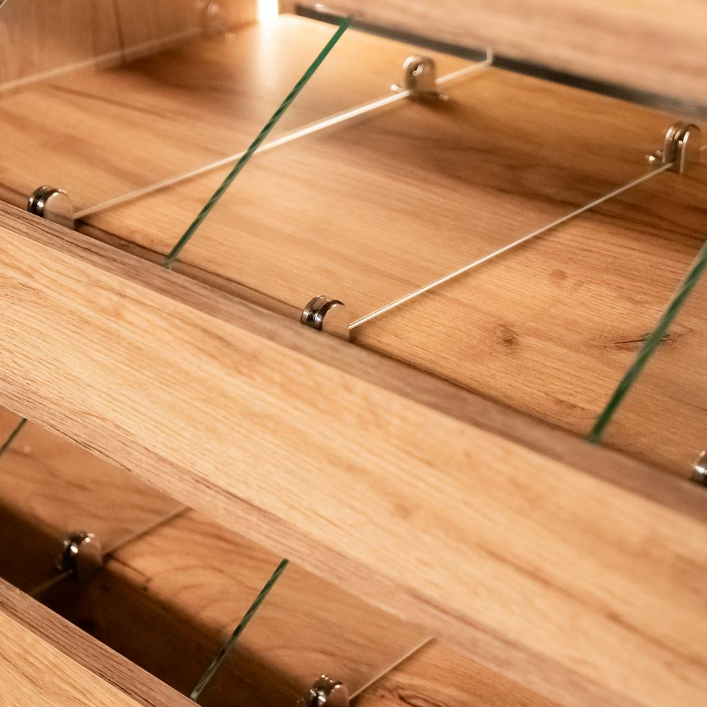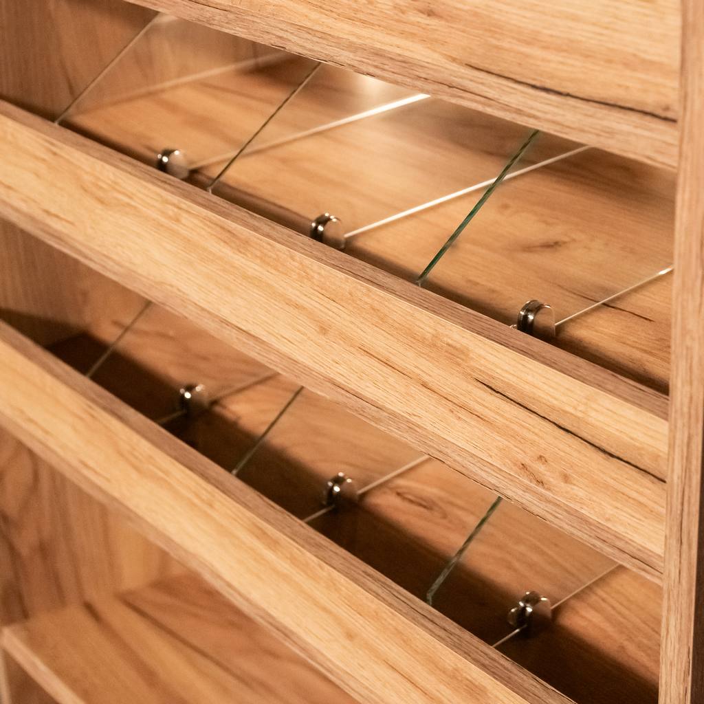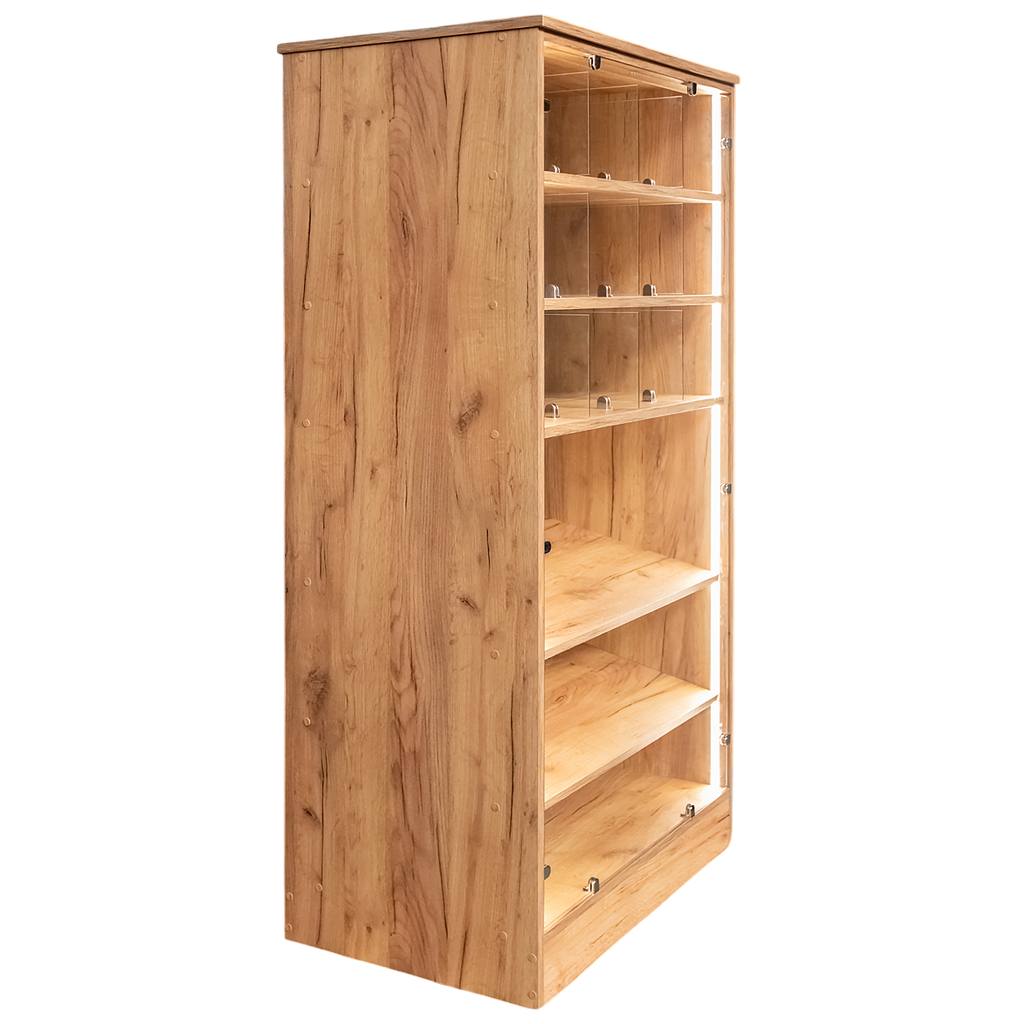 Witryna ekspozycyjna Mega-M to idealne wyposażenie dla sklepów, kawiarni i cukierni, które chcą w atrakcyjny sposób prezentować swoje wyroby, dbając jednocześnie o higienę i estetykę. Starannie zaprojektowana konstrukcja pozwala na efektowne ułożenie ciastek, cukierków, pralin oraz innych łakoci, zapewniając im ochronę przed kurzem i przypadkowym dotykiem. Do produkcji witryny wykorzystano wysokiej jakości płytę meblową, która wyróżnia się trwałością i odpornością na intensywne użytkowanie. Jej eleganckie, naturalne wykończenie sprawia, że wnętrze nabiera przyjaznego, a jednocześnie nowoczesnego charakteru. Witryna doskonale komponuje się zarówno w klasycznych, jak i nowoczesnych aranżacjach lokali handlowych i gastronomicznych.