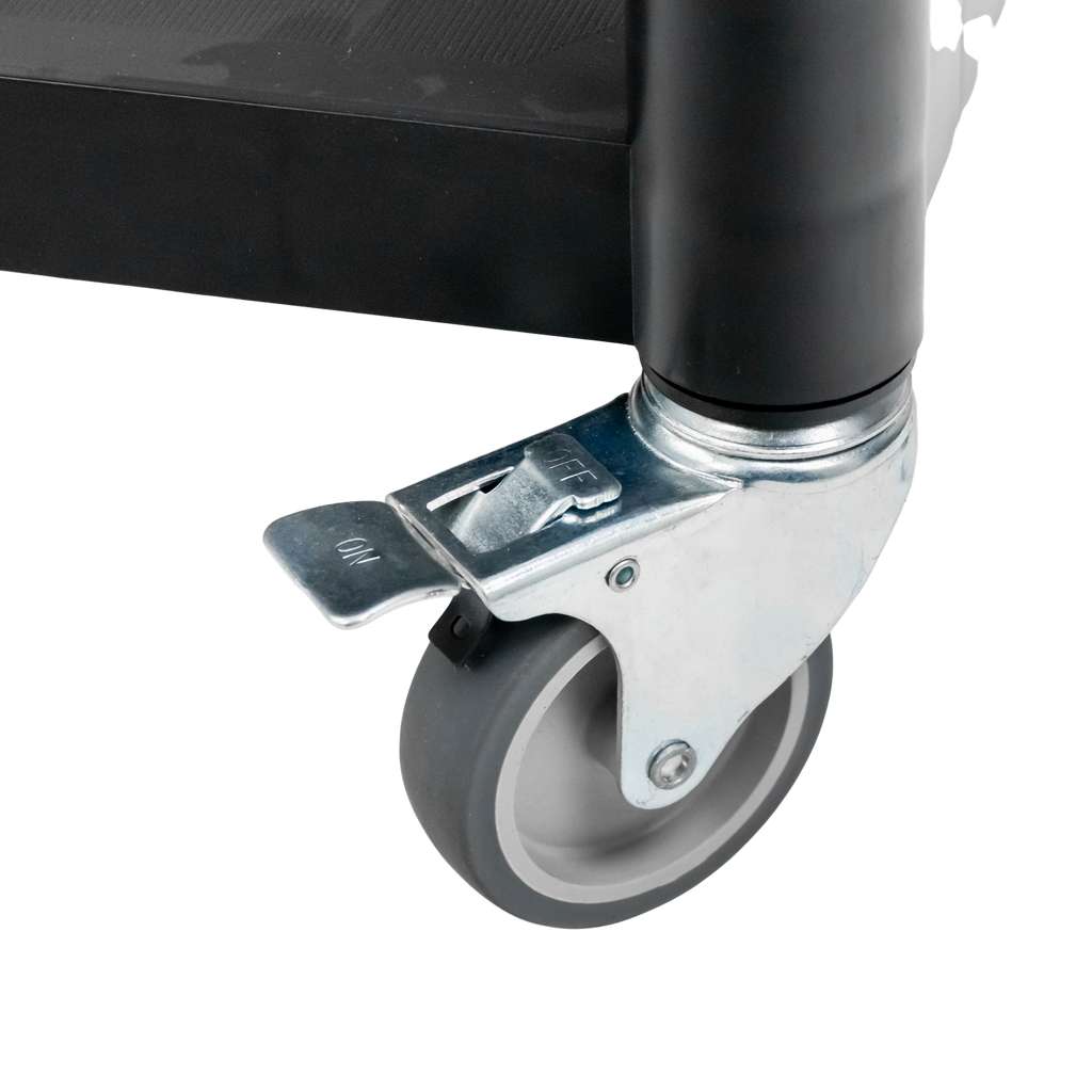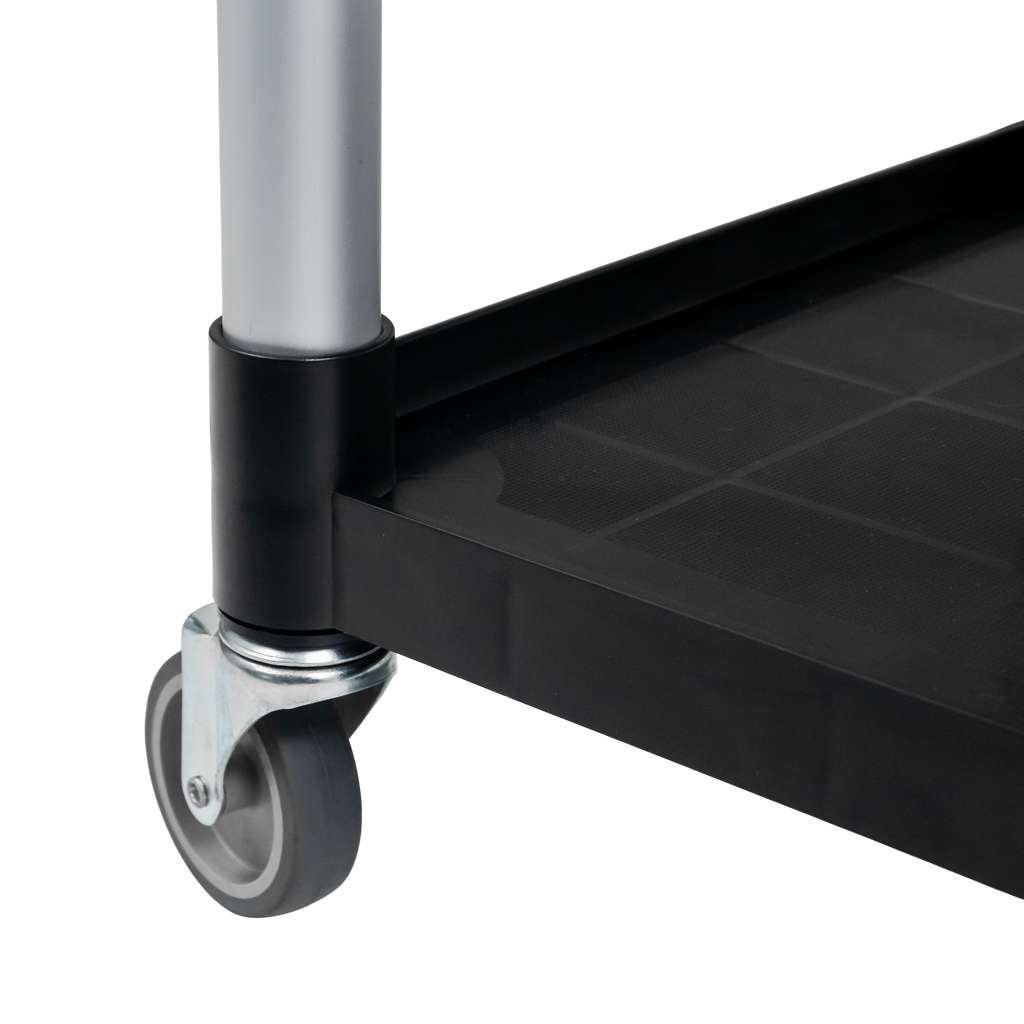 Korpus wózka wykonano z trwałego tworzywa sztucznego w eleganckim, czarnym kolorze. Stabilność zapewnia solidna konstrukcja wyposażona w okrągłe rurki aluminiowe. Trzy przestronne półki przyśpieszają pracę, dodatkowo podwyższone krawędzie zapobiegają zsuwaniu się przedmiotów podczas transportu.  Wózek posiada 4 skrętne kółka, w tym dwa z hamulcem, co gwarantuje pełną kontrolę i bezpieczeństwo użytkowania.
