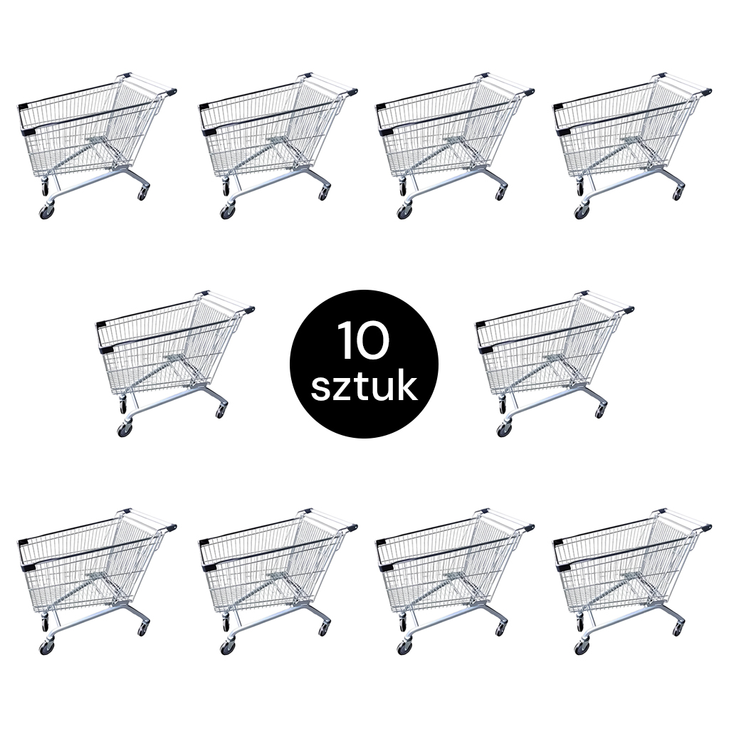 Zestaw 10 sztuk pojemnych wózków sklepowych Mega-M YR 240 L to niezastąpione wyposażenie każdego dużego sklepu samoobsługowego, supermarketu, czy hurtowni. Konstrukcja z wysokogatunkowego drutu stalowego, powłoka galwaniczna i przemyślane detale konstrukcyjne czynią ten model wyjątkowo trwałym, funkcjonalnym i bezpiecznym w codziennym użytkowaniu. Kosz o pojemności 240 litrów pozwala na komfortowe przewożenie większych zakupów, a cicho pracujące kółka zwiększają wygodę zarówno klientów, jak i obsługi sklepu.