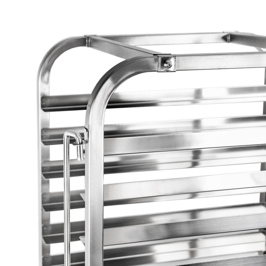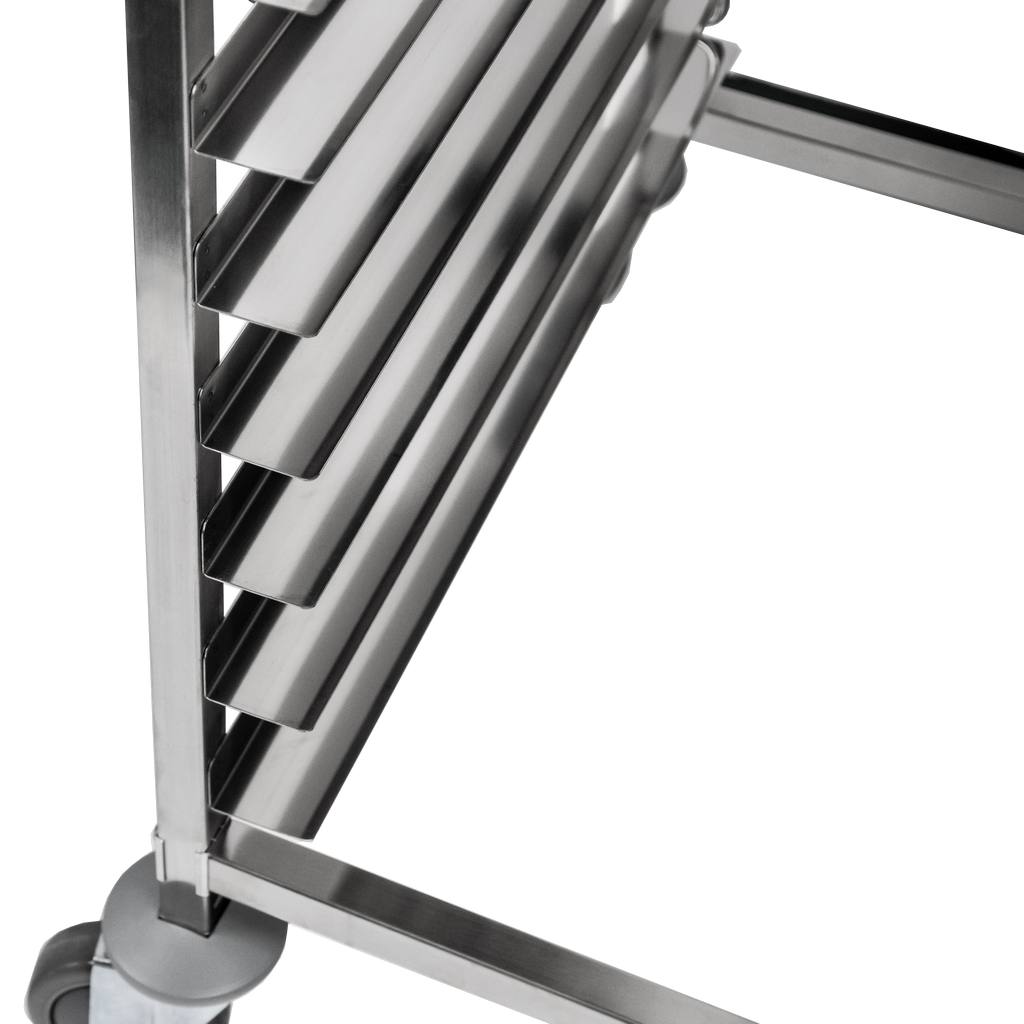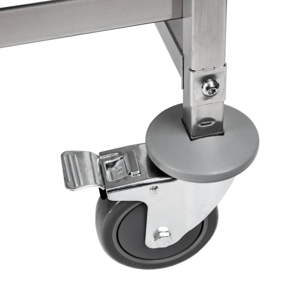 Regał mobilny posiada dwie pionowe blokady chroniące przed ześlizgnięciem się przewożonych tac. Mebel został wyposażony w 4 kółka oraz 2 hamulce zapewniające jego stabilność. Dzięki wykonaniu ze stali nierdzewnej wózek wyróżnia się dużą wytrzymałością.
