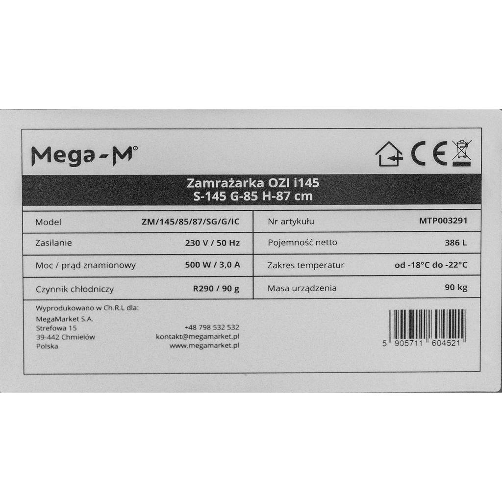 Zamrażarka Mega-M OZI i145 Automatyczne rozmrażanie S-145 cm G-85 cm H-87 cm N