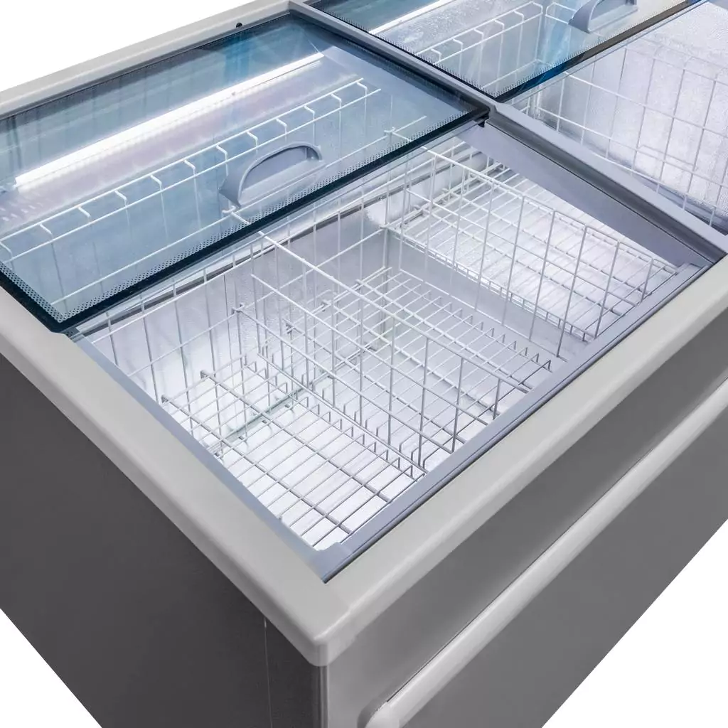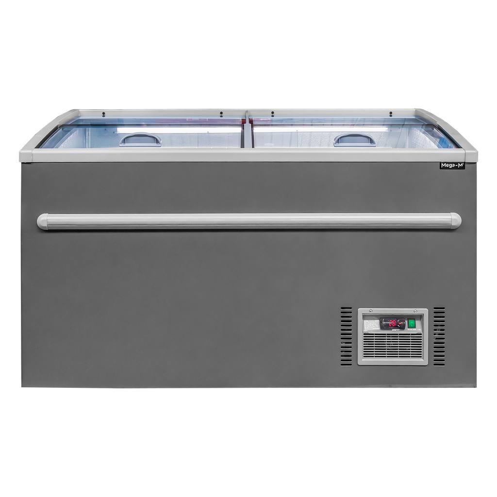 Zamrażarka przemysłowa skrzyniowa marki Mega-M o pojemności 386 l przeznaczona jest do zamrażania i ekspozycji produktów żywnościowych. Charakteryzuje się nowoczesnym wzornictwem, ale też wygodą użycia i funkcjonalnością. Witryna przeszklona umożliwia mrożenie i ekspozycję lodów, owoców, warzyw, mięsa, ryb oraz mrożonych produktów gotowych. W urządzeniach zastosowane zostały podzespoły renomowanych marek gwarantujących długą żywotność produktu. Profesjonalna zamrażarka przeszklona posiada nowoczesną konstrukcję otwierania, która dzięki przesuwnej szybkie, umożliwia korzystanie z bonety mroźniczej kilku osób w tym samym czasie. Zamontowane oświetlenie LED poprawia widoczność mrożonych produktów.