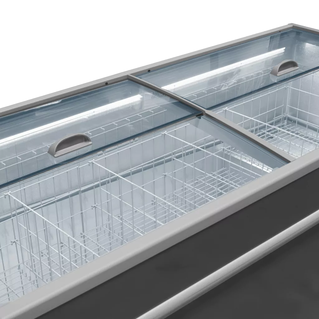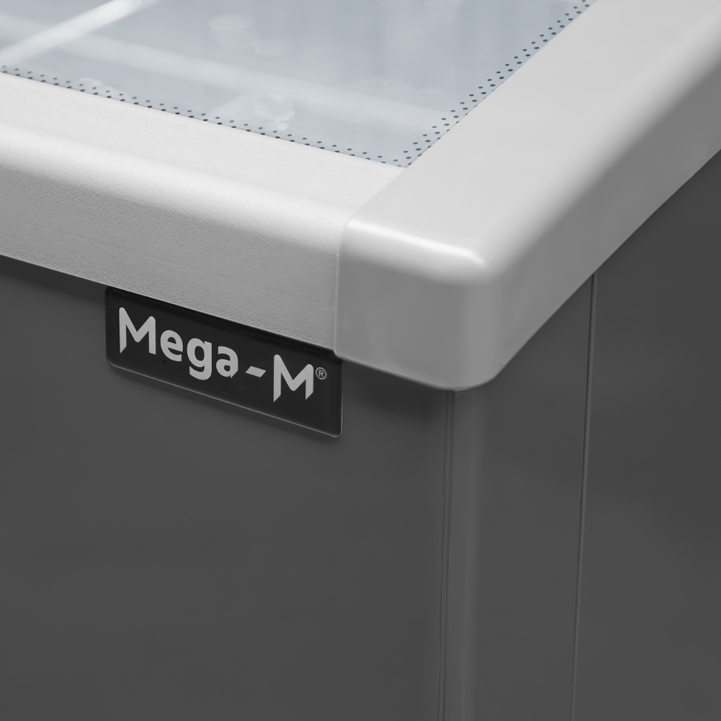 Zamrażarka przemysłowa skrzyniowa marki Mega-M o pojemności 621 l przeznaczona jest do zamrażania i ekspozycji produktów żywnościowych. Charakteryzuje się nowoczesnym wzornictwem, ale też funkcjonalnością i wygodą użycia. Witryna przeszklona umożliwia mrożenie i ekspozycję lodów, owoców, warzyw, mięsa, ryb oraz gotowych dań. W urządzeniu zastosowano wysokiej jakości podzespoły, które gwarantują długą żywotność produktu. Profesjonalna zamrażarka posiada wygodną konstrukcję otwierania z przesuwną szybą, która umożliwia korzystanie z bonety mroźniczej kilku osób jednocześnie. Zamontowane oświetlenie LED poprawia widoczność przechowywanych produktów.